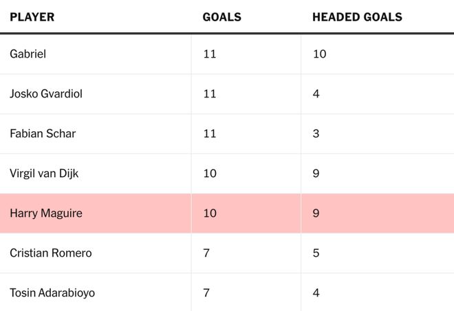 自2019年夏天以8000万英镑加盟以来,马奎尔已在各项赛事打入17球,其中13球(约76.5%)为头球。同期,英超进球超过10球的后卫中,只有本·米、范戴克和祖玛比他有更高的头球进球比例。2023-24赛季以来,在英超的中卫里,只有阿森纳的加布里埃尔进球数多于马奎尔(加布里埃尔11球,马奎尔10球)。也只有他的头球进球数(10个)多于马奎尔(9个)。